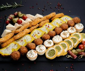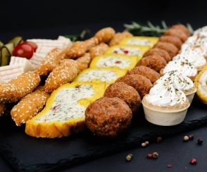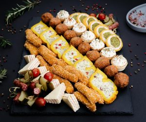 Ingrediente: Crochete de pui cu susan, Chifteluţe de porc, Ruladă de pui cu mălai, Ruladă de caşcaval cu ardei, Minifrigărui de cârnăciori cu castraveţi muraţi, Boucheuri de brânză şi boia afumată, Doboş cu şuncă şi caş, Roşii cherry.