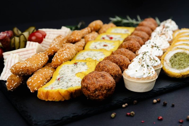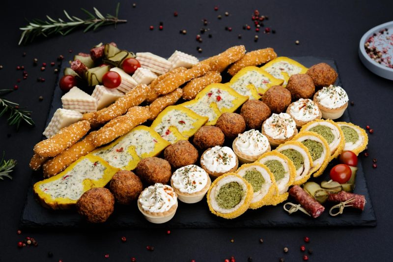 Ingrediente: Crochete de pui cu susan, Chifteluţe de porc, Ruladă de pui cu mălai, Ruladă de caşcaval cu ardei, Minifrigărui de cârnăciori cu castraveţi muraţi, Boucheuri de brânză şi boia afumată, Doboş cu şuncă şi caş, Roşii cherry.