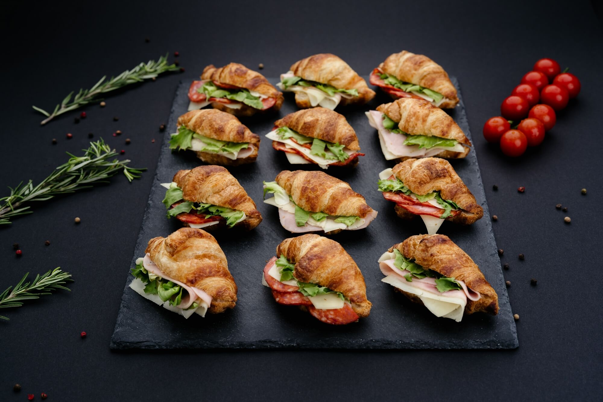 Ingrediente: Croissante cu crema de branza, mix salata, cascaval si salam chorizo; Croissante cu crema de branza, mix salata, cascaval si sunca.