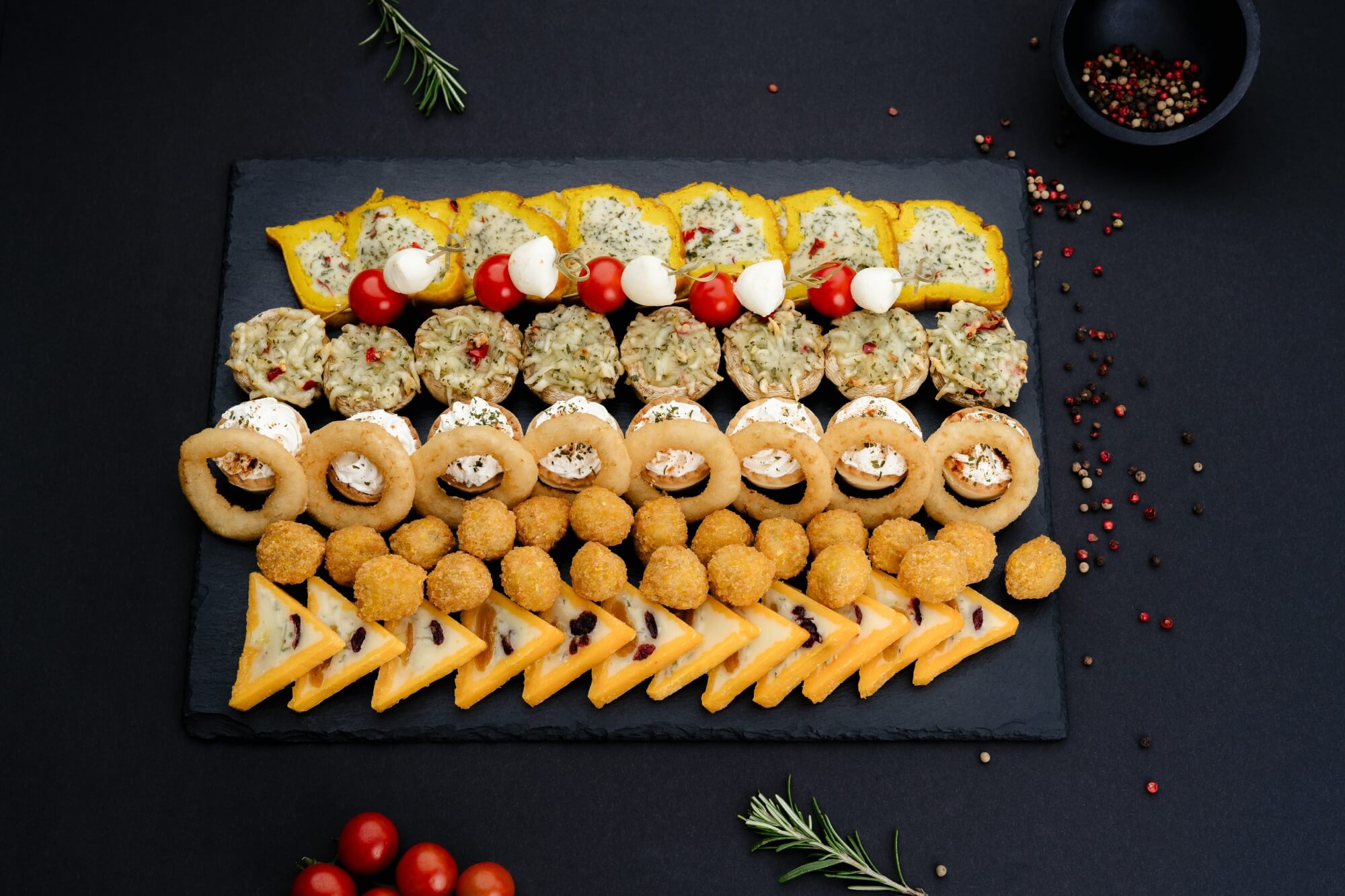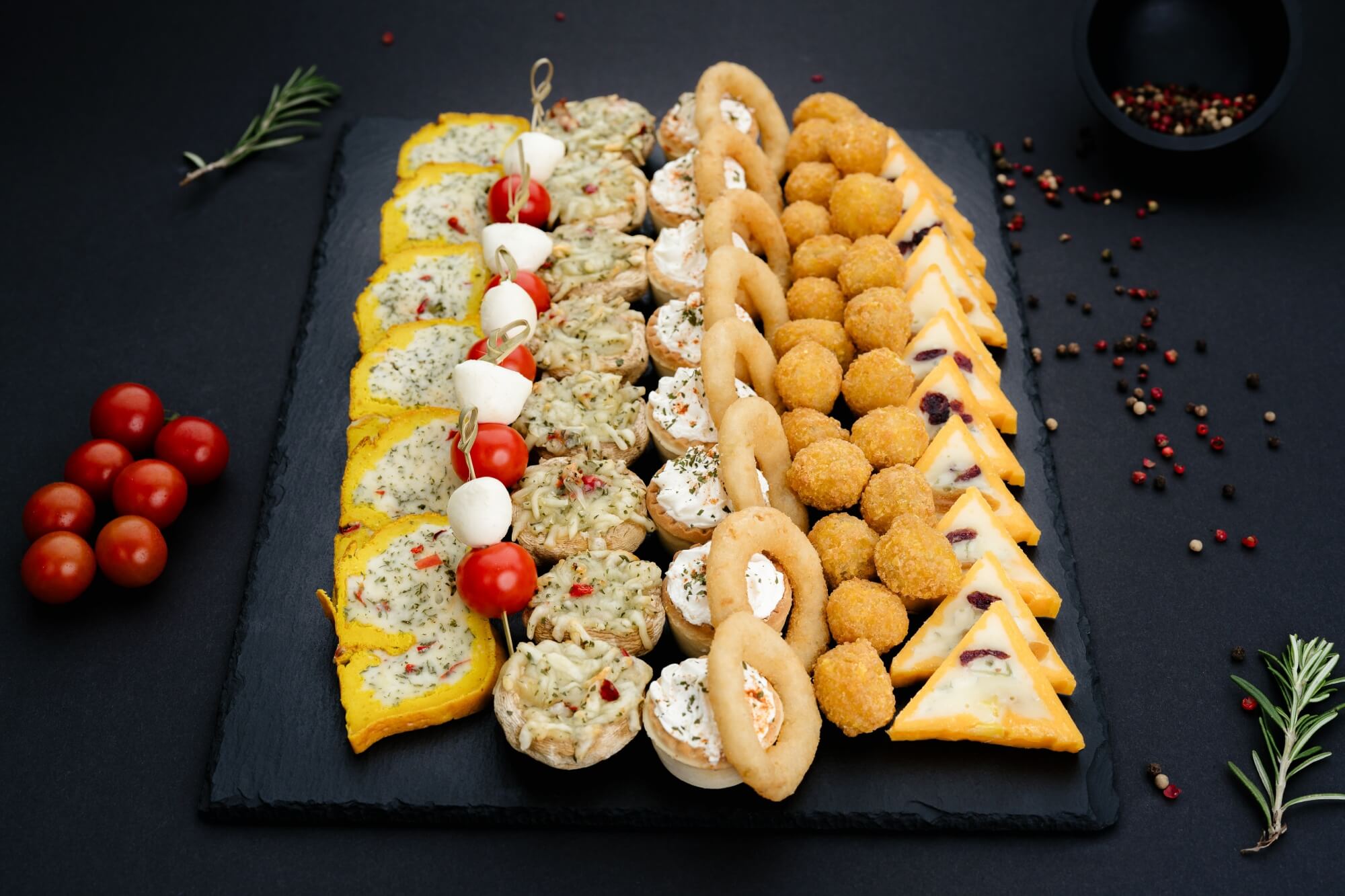 Ingrediente: Ruladă de caşcaval cu ardei, Praline de brânză, Minifrigărui caprese, Ciuperci cu brânză şi ardei, Bărcuţe cu cremă de brânză, Terină de brânzeturi, Inele de ceapă pané, Roşii cherry.