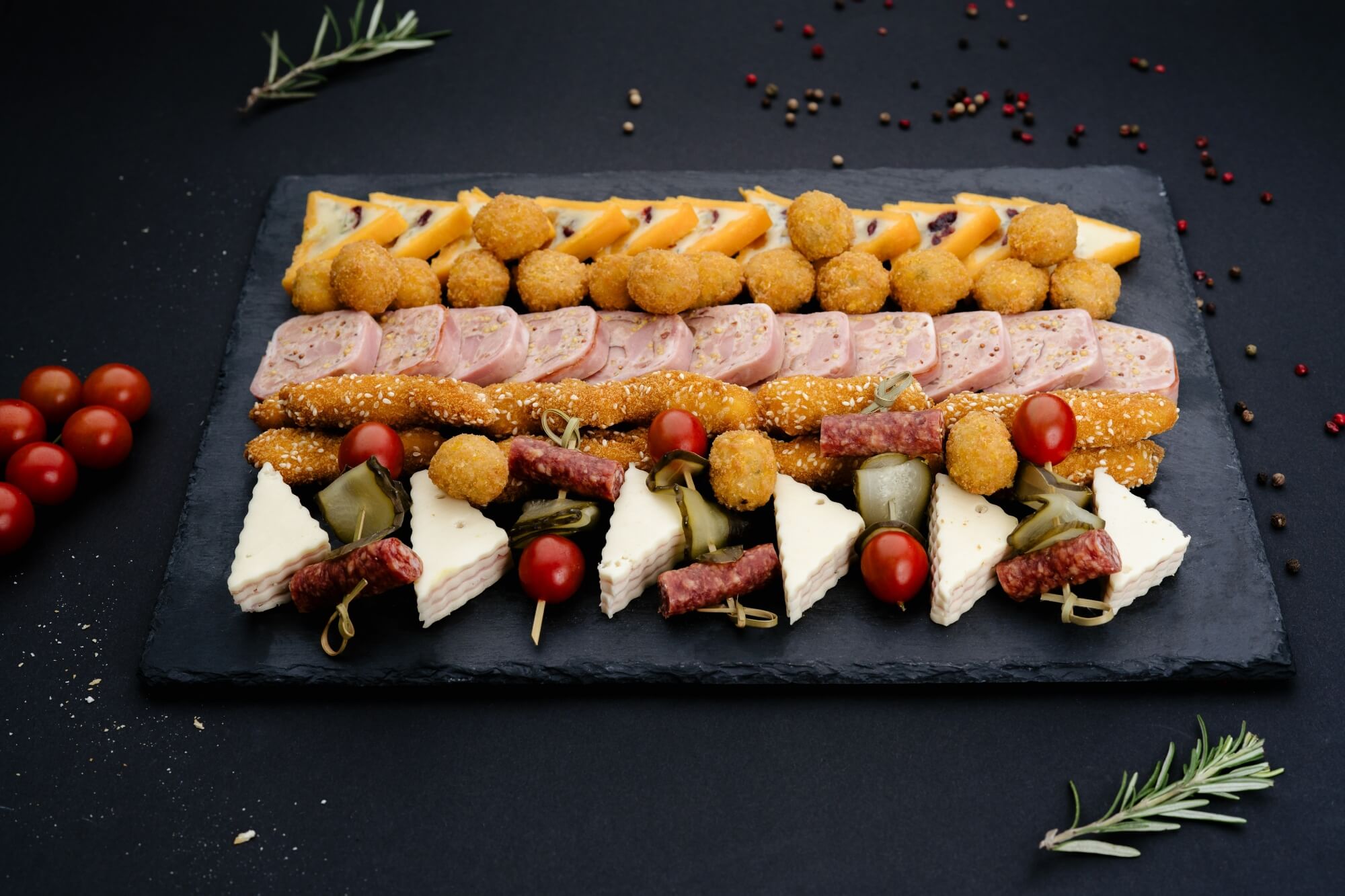 Ingrediente: Crochete de pui cu susan, Doboş cu caş şi şuncă, Minifrigărui de cârnăciori cu castraveţi muraţi, Praline de brânză, Terină de ciolan, Terină de brânzeturi, Roşii cherry.